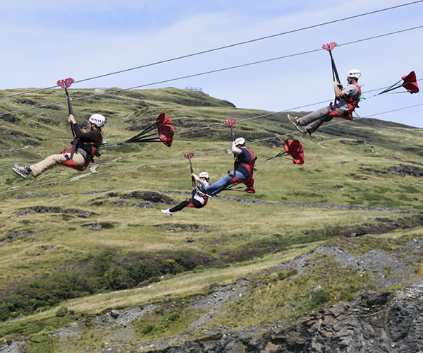 Zip World Titan opened in June 2014 at Llechwedd Slate Caverns, near the historic slate mining town of Blaenau Ffestiniog. This is the first 4 person zip line in Europe